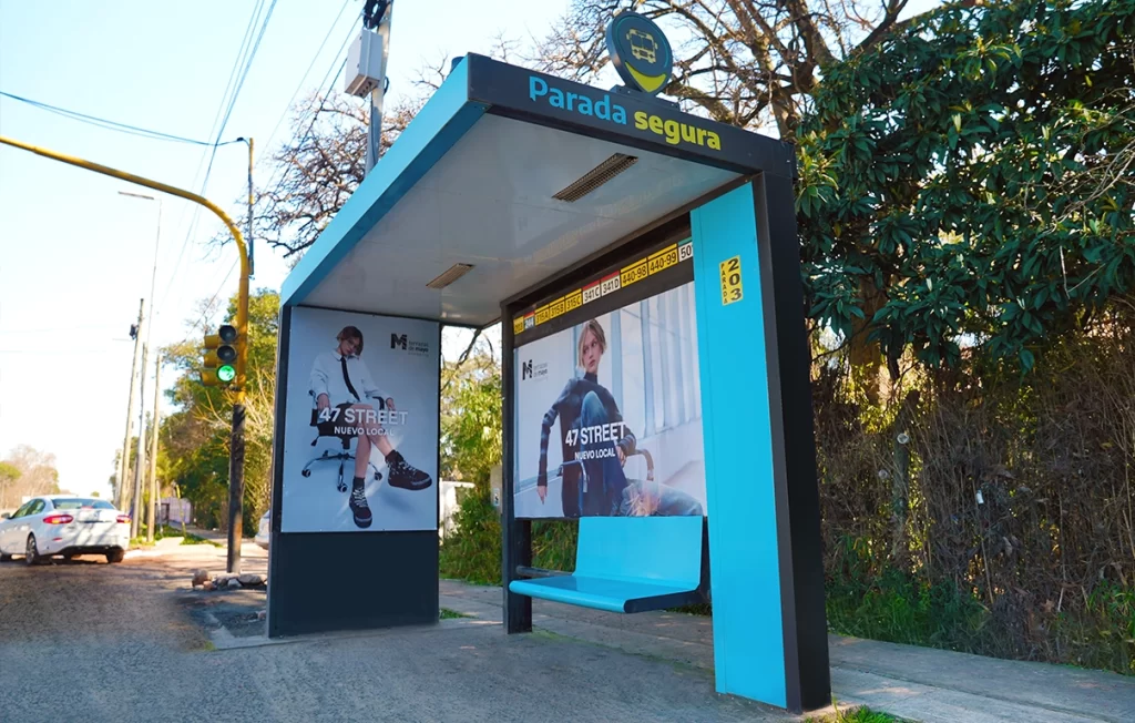 Publicidad cercana al peatón en paraderos de transporte. Tres caras visibles que aseguran exposición prolongada y contacto directo con la audiencia.