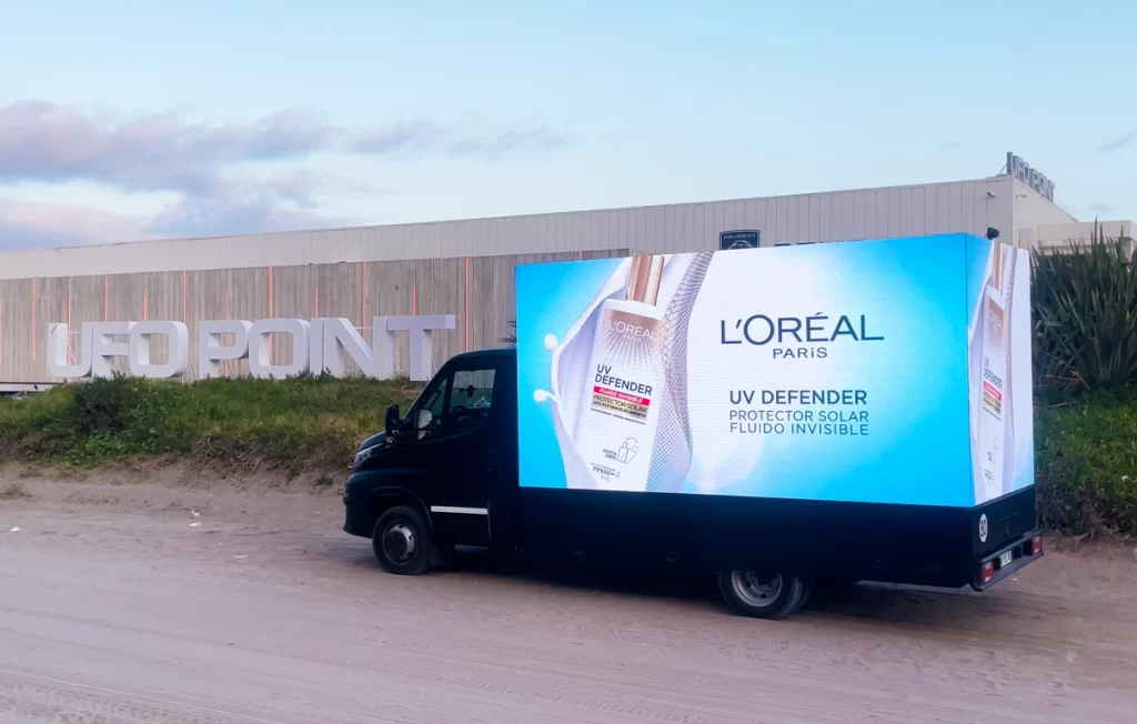 Pantalla móvil que se eleva hasta 4 metros de altura. Llega a donde está tu público con impacto, versatilidad y una visibilidad que no pasa desapercibida.
