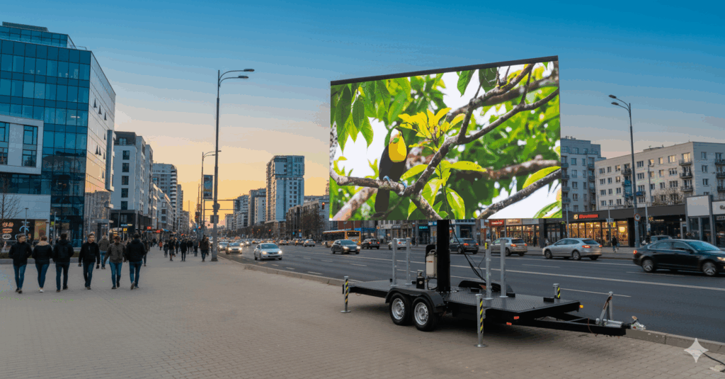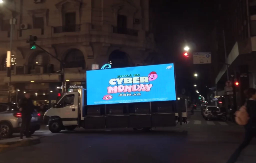 Pantalla digital transportada en remolque, con sistema elevable para mayor visibilidad. Versátil y de fácil traslado, ideal para activaciones y eventos masivos.